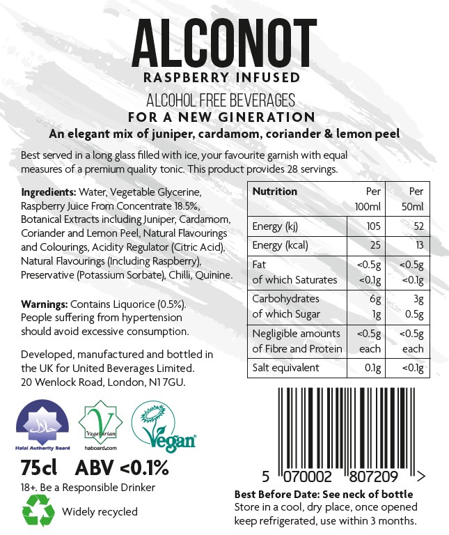 ALCONOTâ„¢ Raspberry Infused is certified by the Vegan Society and as Vegetarian and Halal the Halal Authority Board in the UK